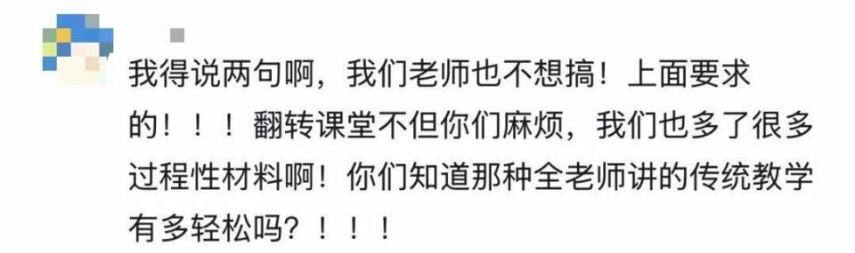 而不满的不只是学生,在评论区中,也有老师留言表示同样不喜欢这种模式——耗费更多精力不说,还可能耽误正常教学进度,若不是学校要求教学创新,自己并不愿意采用。