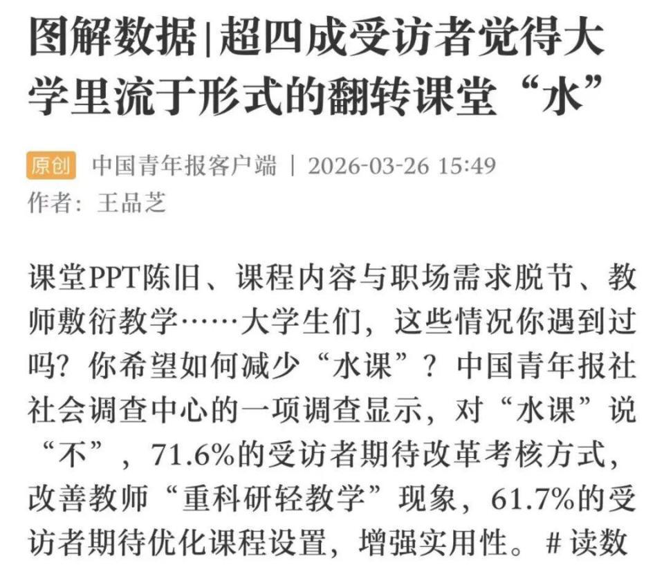 人民日报评论去年就发文称,有一种新型“水课”,打着“翻转课堂”的旗号,将本该激发学生自主研究的教学方式,变成了“课件由学生写、课由学生讲、课后作业也由学生互批”的刻板模式,教师在课堂上全程“隐身”,既不教授知识也不给出建议,只剩一群啥也没学过的学生进行“菜鸡互学”。